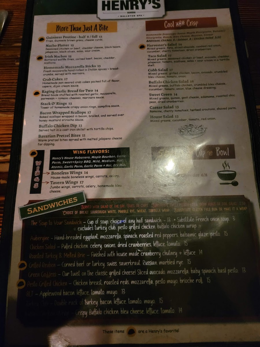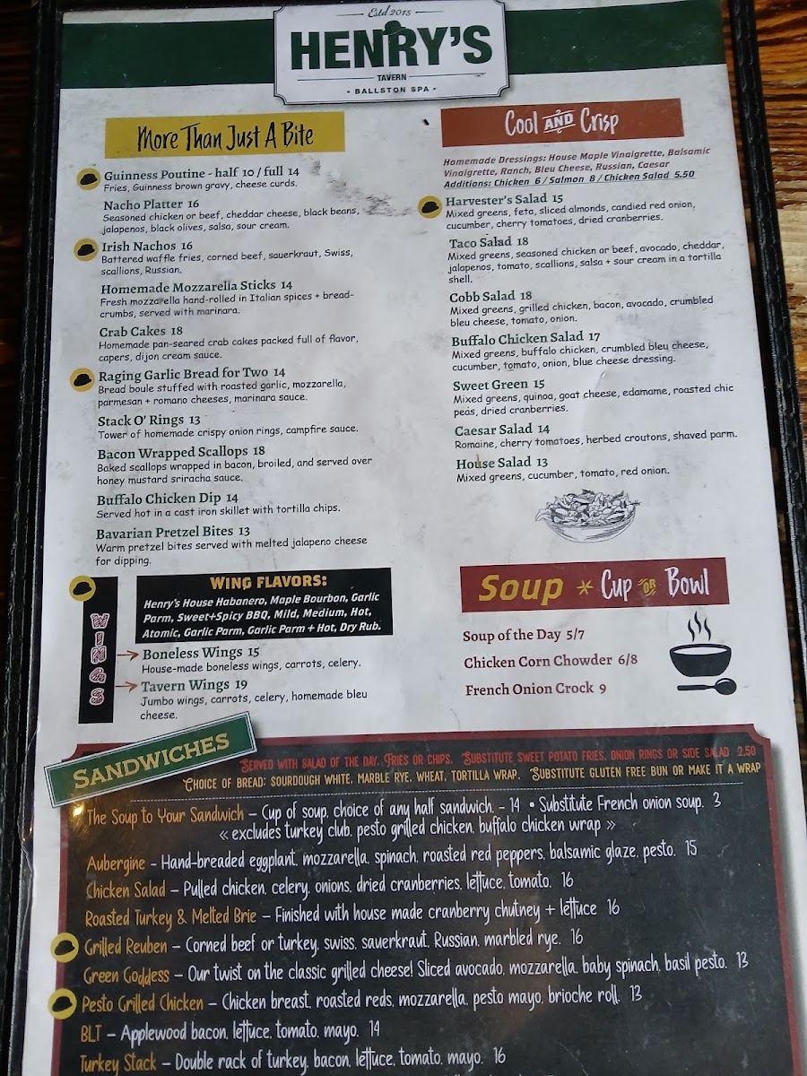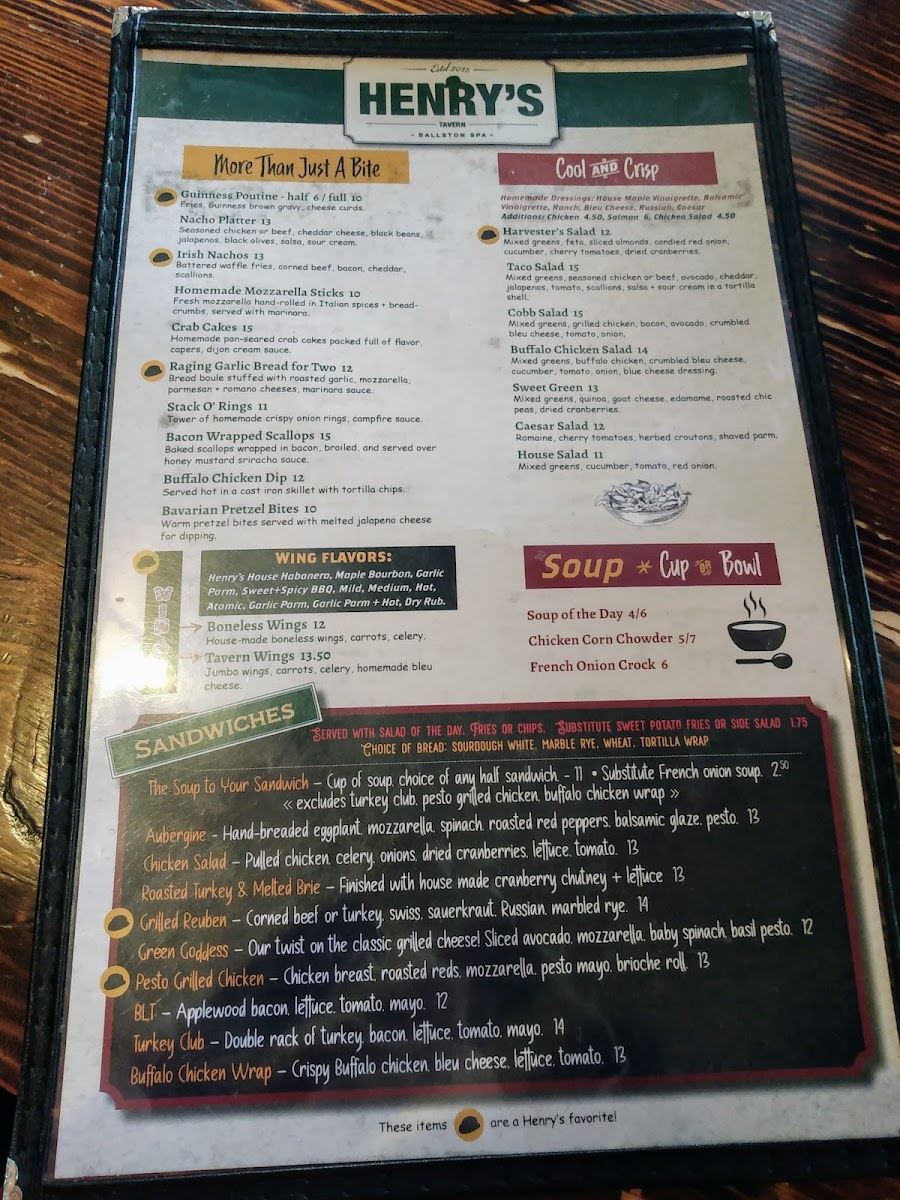 Henry's Tavern offers a thoughtfully curated menu that balances comforting bar & grill classics with a few elevated, hearty dishes. The selection is perfect for casual lunches, relaxed dinners, or weekend brunches enjoyed in a cozy pub atmosphere. You’ll find a variety of satisfying options from hand-cut wings and Irish nachos to more filling plates like chicken pot pie and mushroom & asparagus risotto.